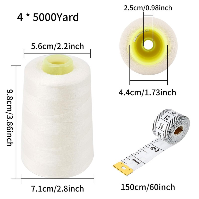 - Package Includes:You will receive 4 large cones (5000 yards each) of polyester thread for sewing machines with a total length of 20,000 yards and a thickness of 40S/2. A soft PVC measuring tape is included for your ease of use