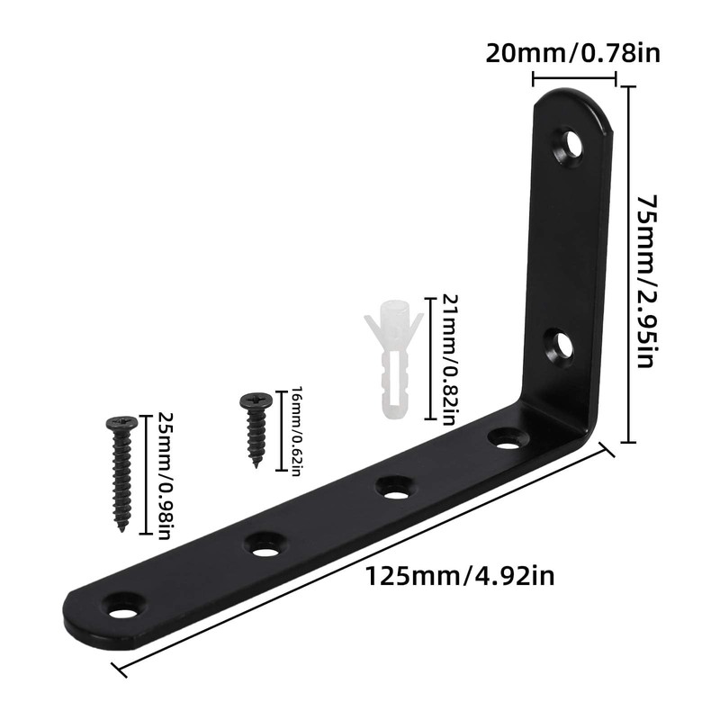 - Box contents: you will receive four shelf brackets 120 x 75 x 20 mm (thickness 3 mm, opening 5 mm) + 8 long screws (25 mm) + 8 short screws (16 mm) + 8 dowels (21 mm). Complete accessories and accurate size.