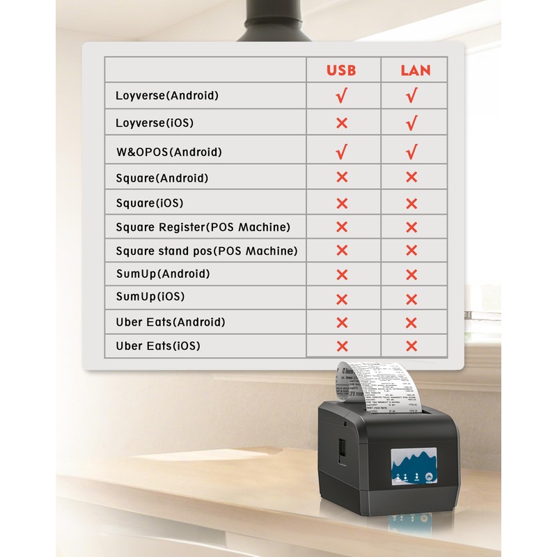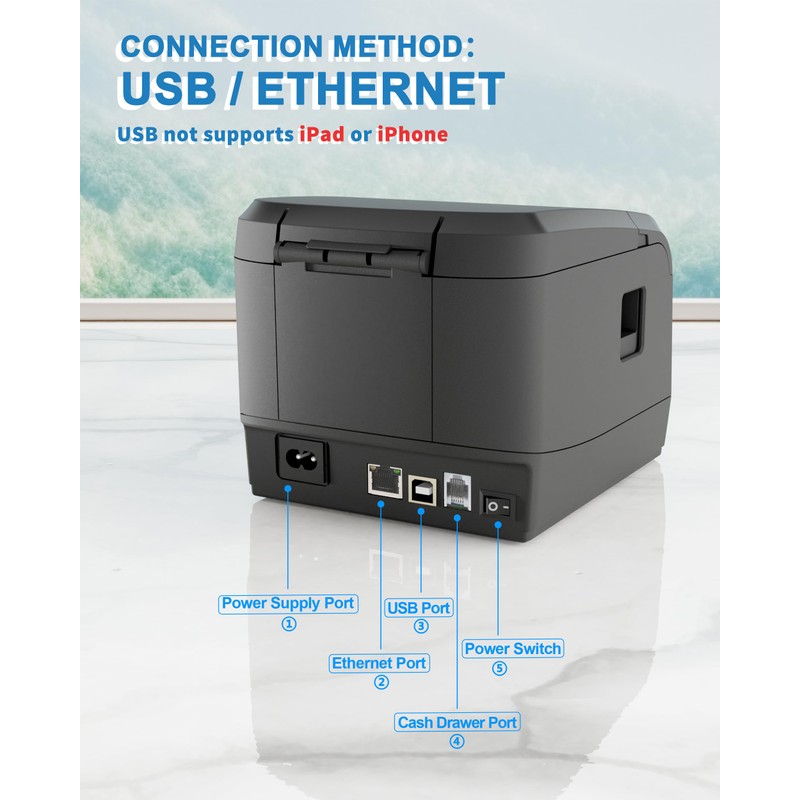 • Compatibility: ZY908 thermal printer supports USB and LAN connection, compatible with Windows, Android, Linux, ChromeOS, Cash Drawer. does not support Bluetooth and WiFi connection, not compatible with IOS,Square, Shopify, Izettle, Grubhub, QuickBooks