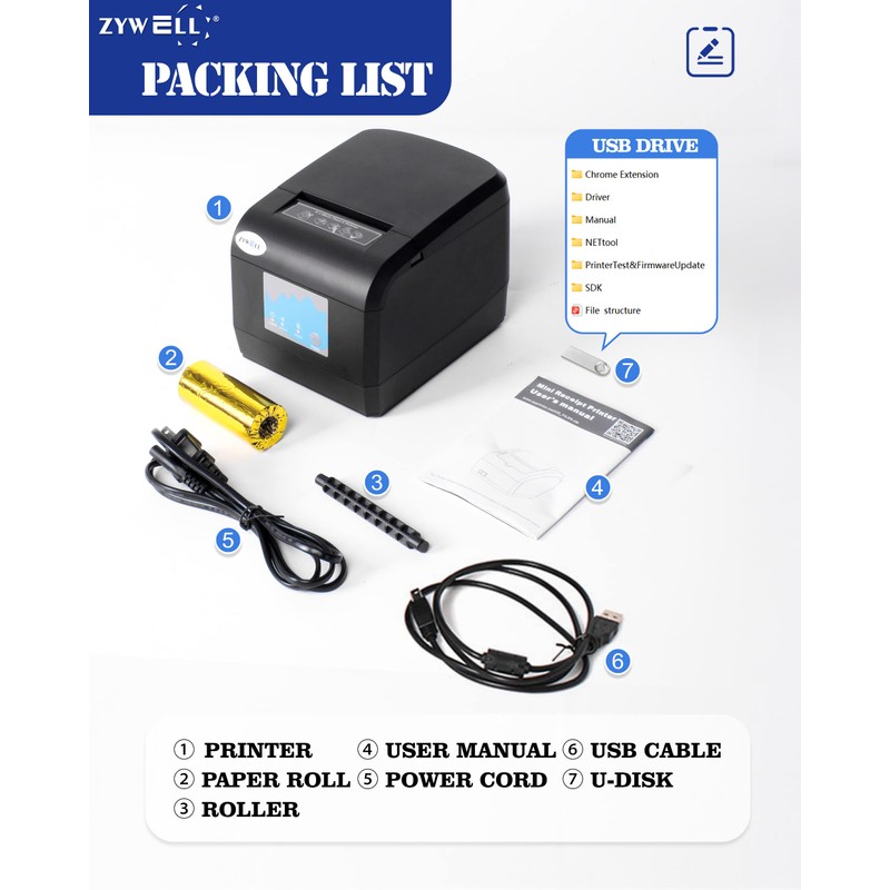 【Product Description】 What's in the box——①Printer ②U-Disk ③Power Cord ④Paper Roll ⑤Roller ⑥User Manual ⑦USB Cable