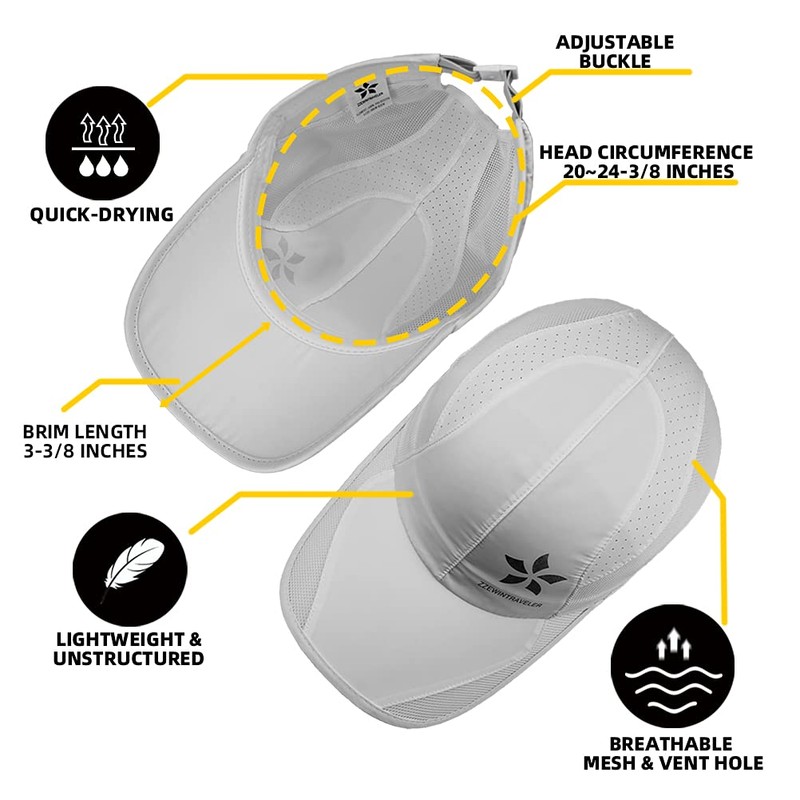 ZZEWINTRAVELER Running Cap for Men Quick Dry Sports Cap Lightweight Breathable Soft Adjustable Hat Unisex (White, Classic Buckle)