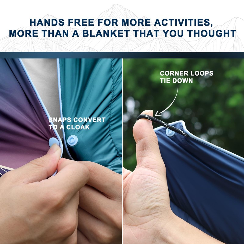 - 2.Functional Designs: The poncho snaps design could transform the puffy blanket into a cloak and make your hands available while you are drinking, eating, chatting or doing some campsite tasks and still keep you cozy. Buttoning up the snaps makes the soft blanket be a simple sleeping bag; two blankets can also be connected as a larger sleeping bag. Loops at the four corners allow you to stake the camping blanket into the ground and you can use it as a picnic mat and lie down