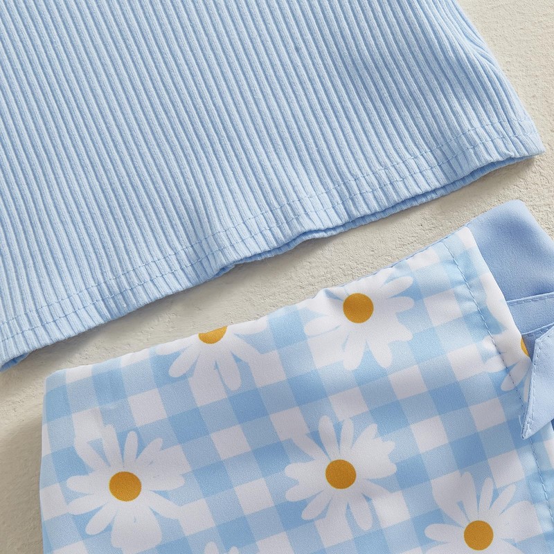 - DESIGN: Baby girl tank top features ribbed knit, sleeveless, lapel down, v-neckline, solid color design. Baby girl shorts features flower plaid print and built-in shorts design, cute and stylish toddler girls outfit summer