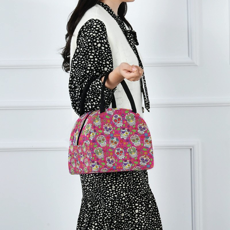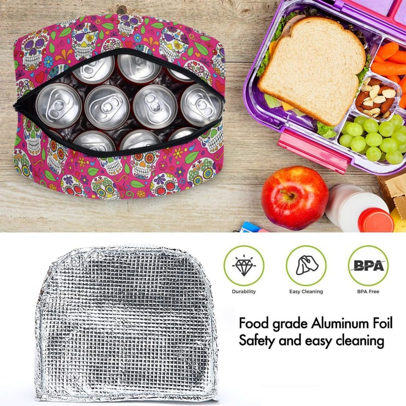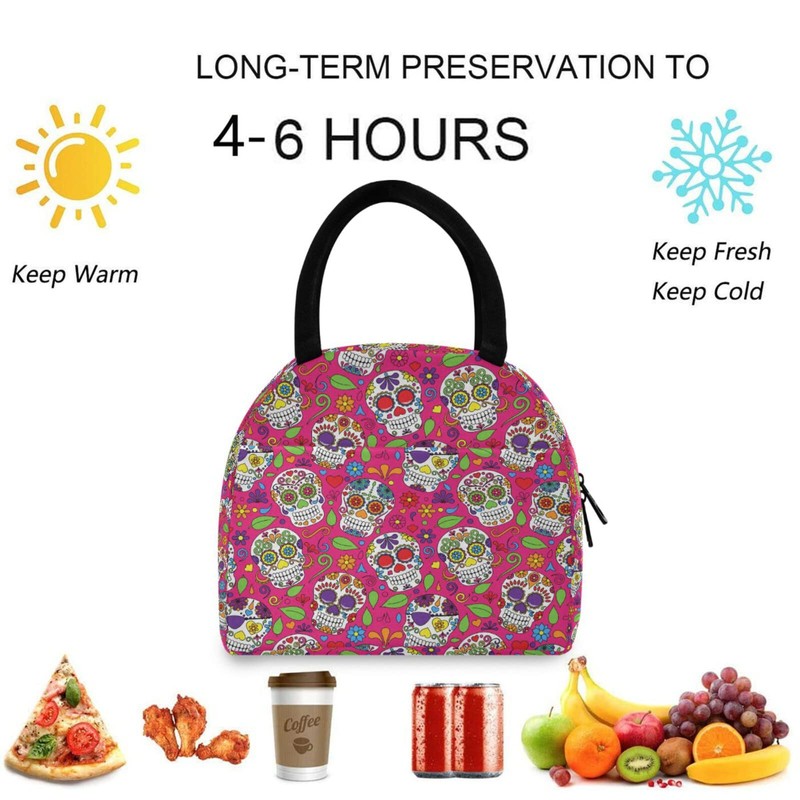 ZzWwR Chic Sugar Skulls Day of the Dead Reusable Lunch Tote Bag with Front Pocket Zipper Closure Insulated Thermal Cooler Container Bag for Man Women Work Picnic Travel Beach Fishing